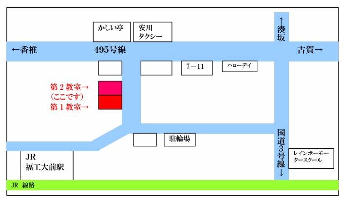 2024年9月より新宮町三代の校舎からJR福工大前駅近くに移転しました。送迎運転手の確保が難しいことなどで送迎がなくなり、皆様にはご不便をおかけすしますが、授業業形式や講師陣は今まで同様で運営しておりま、また送迎がなくなった分授業や個別的な指導に力を注ぐことができるようになりました。今後も受講生のみなさんの良き学習の場として尽力していく所存ですのでどうぞよろしくお願いいたします。